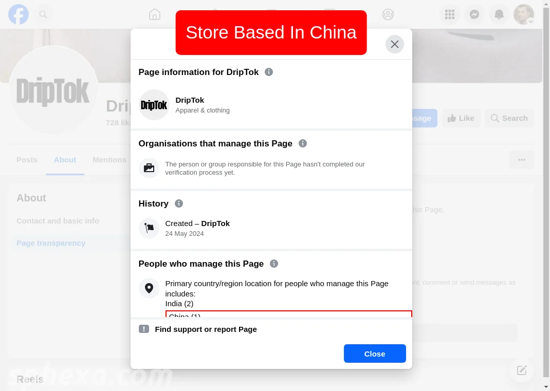 🌏 Store Based in China: Facebook admin location is shown as being in China, which may not match the expected or claimed origin of the company.