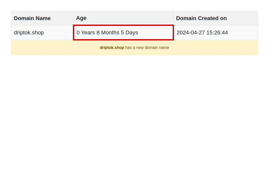 🛑 Very Young Domain: Driptok.shop is only 0 Years 8 Months 5 Days old—this short lifespan raises legitimacy concerns.